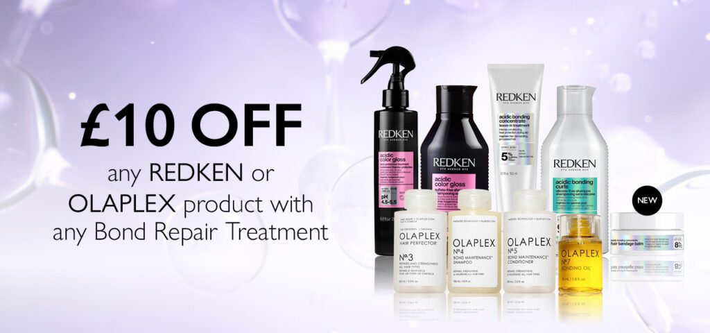 Valid from 1st – 28th February 2026 | Subject to availability | £10 off a take home Olaplex or Redken product with any in-salon Bond Repair treatment.