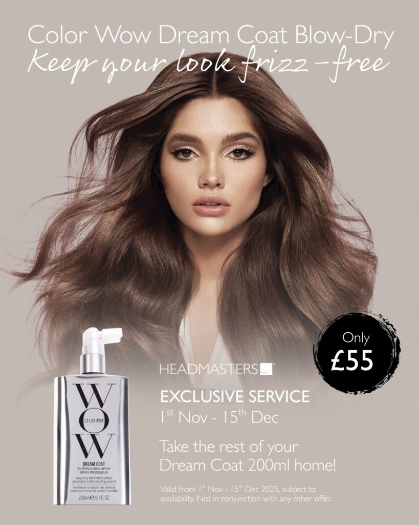 For just £55, enjoy a luxurious in-salon COLOR WOW Dream Coat blow-dry, where your Headmasters stylist opens a new 200ml Dream Coat bottle (worth £27) exclusively for you. After your treatment, you’ll take your bottle home to maintain your smooth, glossy finish for weeks.