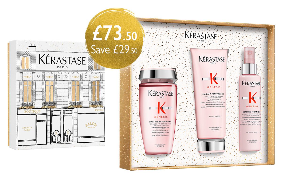 The Kérastase Genesis Gift Set is ideal for anyone experiencing hair fall due to breakage or fragility. This dual-action collection strengthens hair from the root to the tip, helping to reduce breakage and minimise hair fall caused by brushing or styling. Fine or fragile hair is left feeling stronger, softer and more resilient, with a healthy shine and improved manageability.